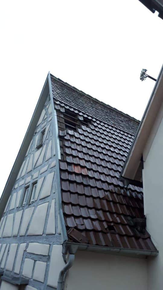 Eine Gruppe mit Leitern und persönlicher Schutzausrüstung war fleißig am Schäden beheben.